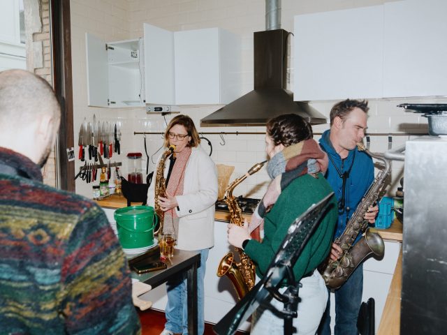 We were there on 11 January and saw, to name but a few examples: a twelve-year-old girl with her portable electronic harp, a twelve-year-old girl with a recorder, men and women with saxophones and a double bass, an elderly lady who came to DJ, a Ukrainian percussionist, a bass player, two cousins who came to sing, a young Syrian man with his oud, a young woman with her inherited accordion, violinists, a Brazilian resident of Ghent with self-made instruments…